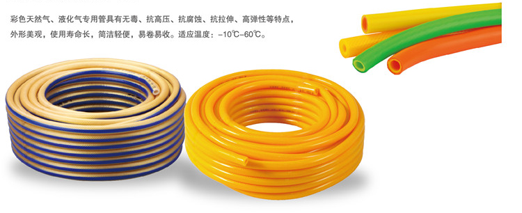 彩色天然氣、液化氣專(zhuān)用管具有無(wú)毒、抗高壓、抗腐蝕、抗拉伸、高彈性等特點(diǎn),外形美觀(guān),使用壽命長(cháng),簡(jiǎn)潔輕便,易卷易收。適應溫度: -109- -60C。