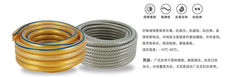 纖維增強管具有無(wú)毒、抗高壓、抗腐蝕、抗拉伸、高彈性等特點(diǎn),中間層為高強度纖維絲纏繞,外形美觀(guān),使用壽命長(cháng),簡(jiǎn)潔輕便,易卷易收。